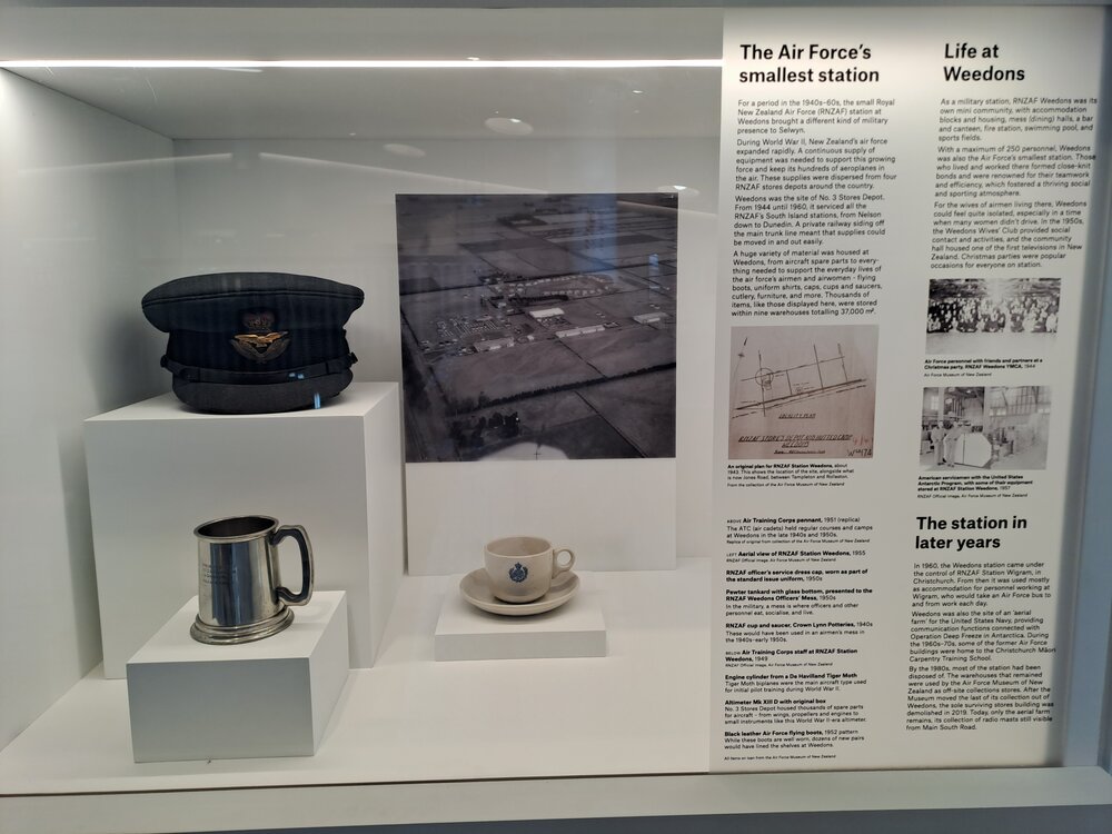 Image: The upper shelf for the Weedons RNZAF air station exhibition, containing three objects on loan from the collection of the Air Force Museum of New Zealand. Left to right:
